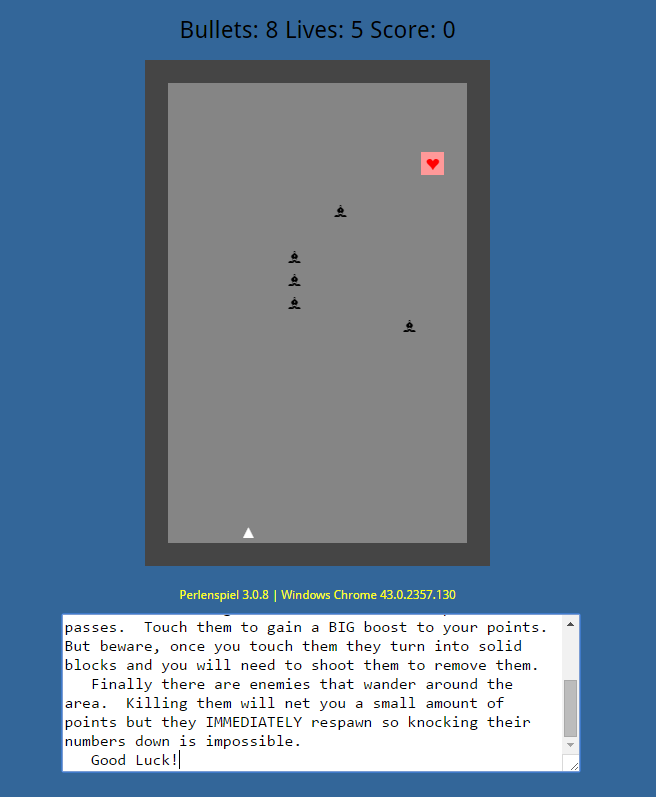 Panic is a 2D shooter. The goal of the game is to get the highest score possible. This is made difficult by the infinite enemies and objects that block your path. It is very simple but don’t let that deceive you, it can be very challenging.